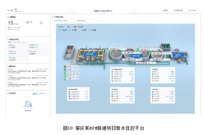 广东肇庆某污水处理厂设计处理水量11×104m3/d,出水执行一级A标准。在当地污水管网提质增效改造后面临3×104m3/d的污水增量问题,原污水处理系统难以有效应对,需进行提量改造,以保障污水及时有效处理。由于项目实施周期短,最终采用BFM工艺并以装配式的方式在厂内新建独立旁位污水处理系统,解决污水增量的问题。新建项目设计水量3×104m3/d,出水执行一级A标准,于厂区内绿化带内实施BFM处理设施新建。项目进水取自现状提升泵房,经过细格栅和旋流沉砂池进行预处理后,通过BFM工艺段,完成核心污染物的去除,最终消毒后外排。新建项目实施完成后,新建吨水占地仅为0.067m2/(m3·d-1)。图9-ii为新建系统占地以及与原污水厂占地对比。从图中可以看出,新建BFM工艺系统仅占用原厂2.5%的占地,处理了21.4%的污水,并且仅用时30d完成建设,有效缓解了进水水量陡增的难题。实际出水COD、NH3-N、TP、SS浓度分别为12.17mg/L、0.80mg/L、0.30mg/L、2.14mg/L,BFM工艺保障了出水水质的稳定达标。本项目同步实施了智能控制系统,如图10所示。现场全部设备、仪表、控制接入智水优控云平台,实现对于水厂运行信息的全面收集。同步配置了手机端小程序,实现随时随地远程管理。云平台内置工艺控制系统,实现精准控制与节能降耗,可较人工控制降低20%以上直接运行费用。