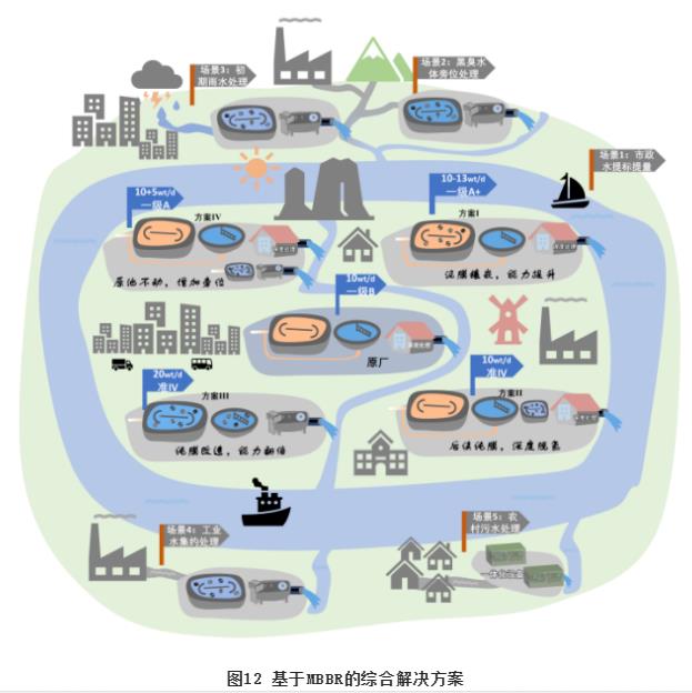 图12展现了MBBR用于水环境综合解决方案,从最初MBBR工艺应用于市政污水处理,到现状MBBR工艺已实现了工业废水处理、黑臭水体治理、初期雨水处理、农村污水处理等多场景应用。实际应用时,应根据项目的实际情况因地制宜的选择解决方案,以期获得最优的实施和处理效果。